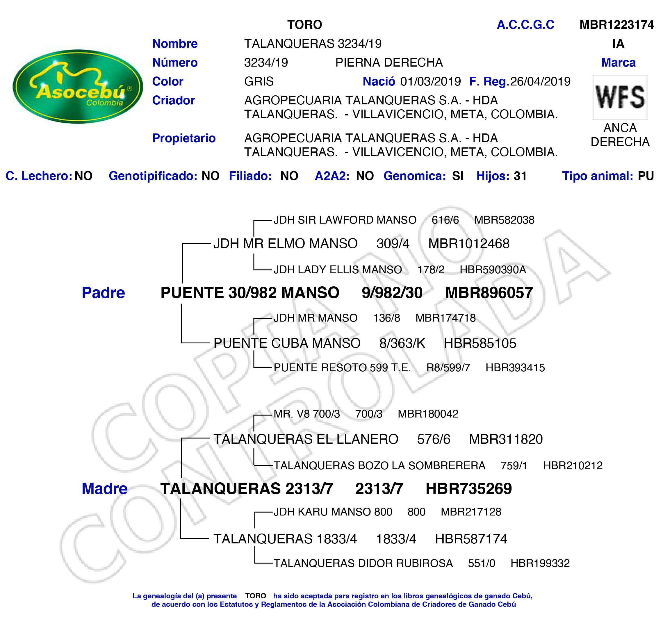 PADRE: PUENTE 30/982 MANSO MADRE: TALANQUERAS 2313/7 RAZA: BRAHMAN GRIS