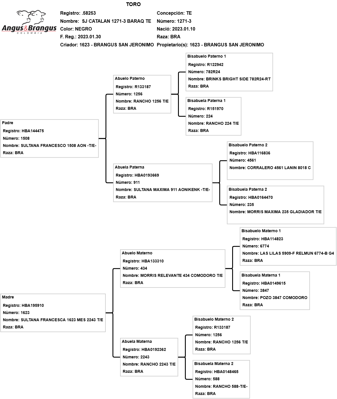 NÚMERO: 1271-3 FECHA DE NACIMIENTO: 10/01/2023 REGISTRO: 58253 RAZA: BRANGUS TIPO: CARNE