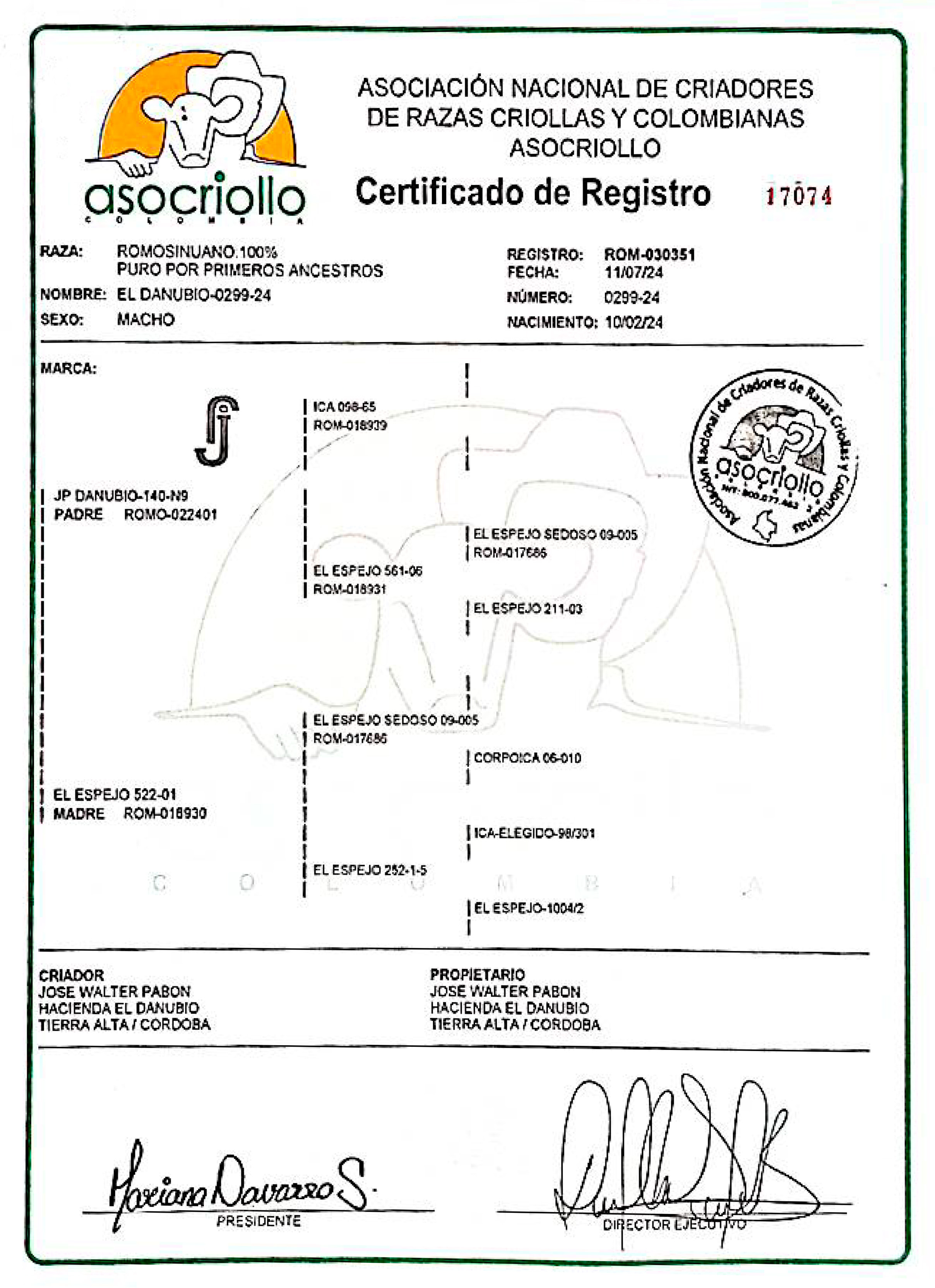 PADRE: JP DANUBIO T40-N9 MADRE: EL ESPEJO 522-01 RAZA: ROMOSINUANO