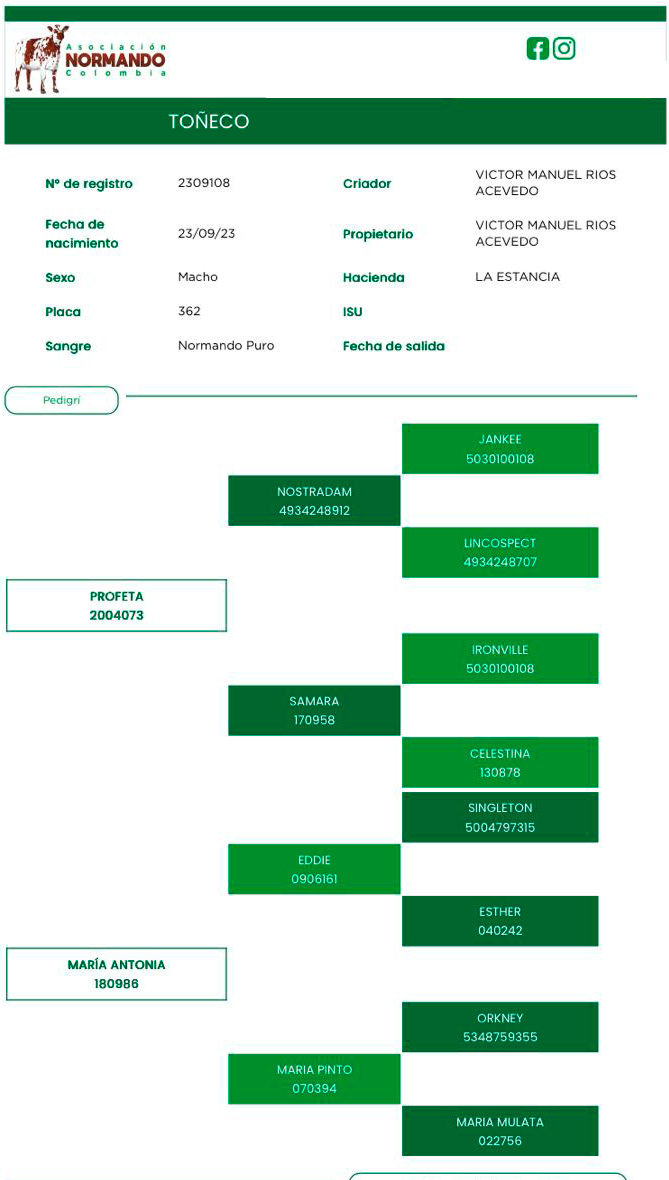PADRE: PROFETA MADRE: MARIA ANTONIA REGISTRO: 2309108 RAZA: NORMANDO