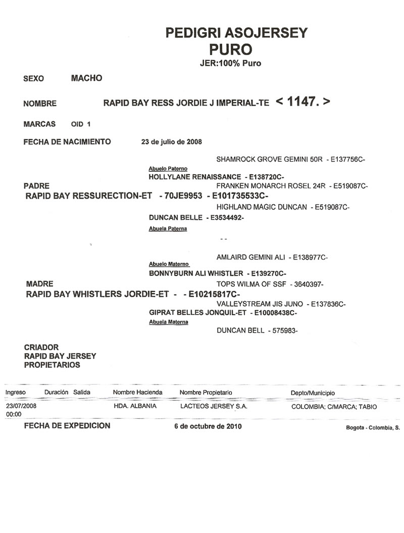 NÚMERO 1 FECHA DE NACIMIENTO: 07/23/2008 TIPO: LECHE REGISTRO: 1147
